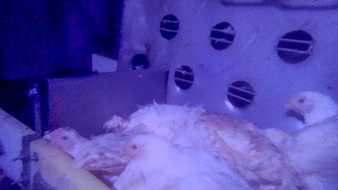 Our new footage shows extremely stressed and panicked chickens dumped from cramped, filthy transport crates onto a crowded conveyor belt.