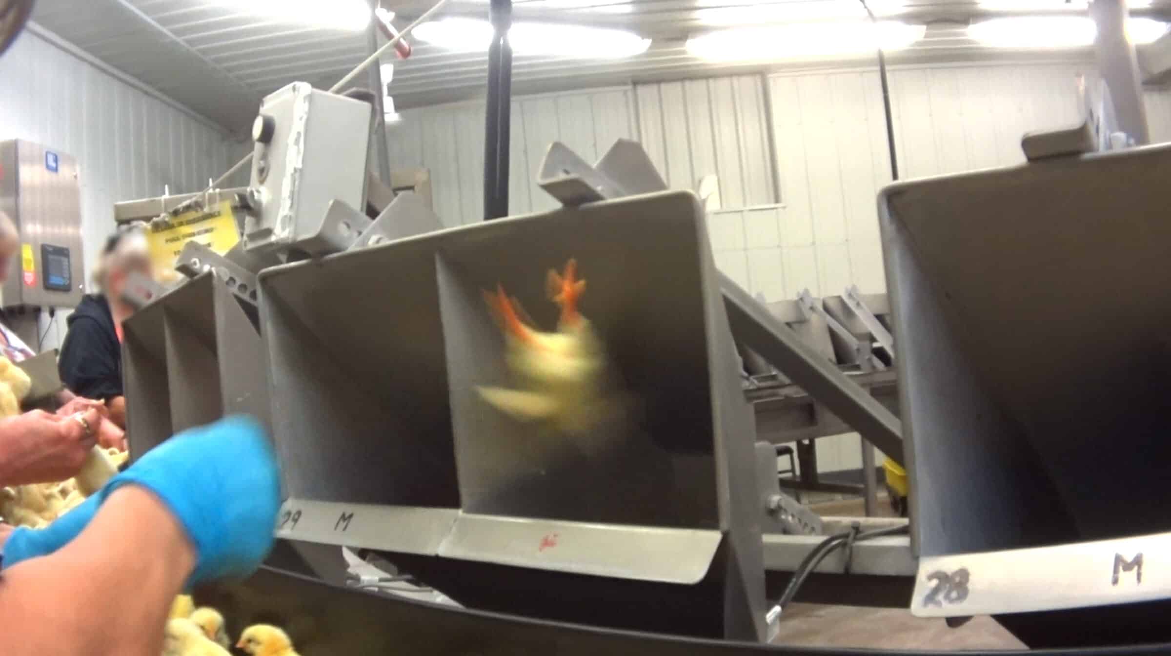 Workers first separate the chicks by sex. During this process, chicks are typically roughly handled and many are injured, as undercover footage has shown. Males are then placed on a conveyor belt that drops them into a “macerator,” a machine that shreds the animals alive—all while they’re fully conscious and able to experience pain and fear. Other methods of killing chicks include gassing, which causes prolonged deaths and distress, and “cervical dislocation” (i.e., breaking their necks).