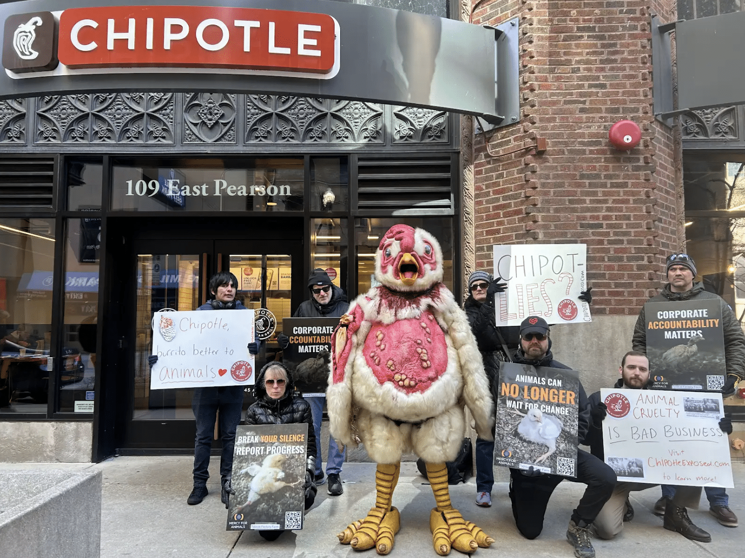During this protest, demonstrators used inflatables to bring attention to animal suffering in Mod Pizza’s supply chain.