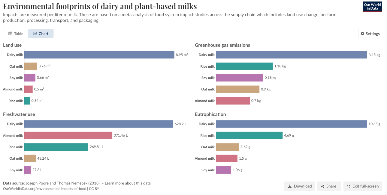 Animal agriculture is a leading contributor to many of the world’s most pressing environmental concerns, and plant-based milk has a significantly lower environmental impact than cows’ milk across essentially all sustainability metrics. For example, compared with cows’ milk, oat milk production generates three times fewer greenhouse gas emissions, takes up 11 times less land, and uses 13 times less fresh water.