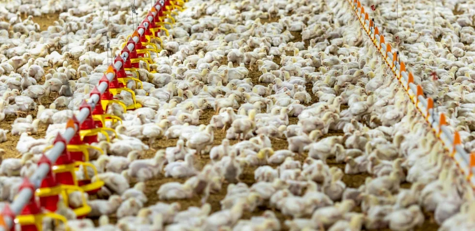 Chickens raised for meat suffer cramped conditions, effects of cruel breeding practices, and horrific slaughter methods.